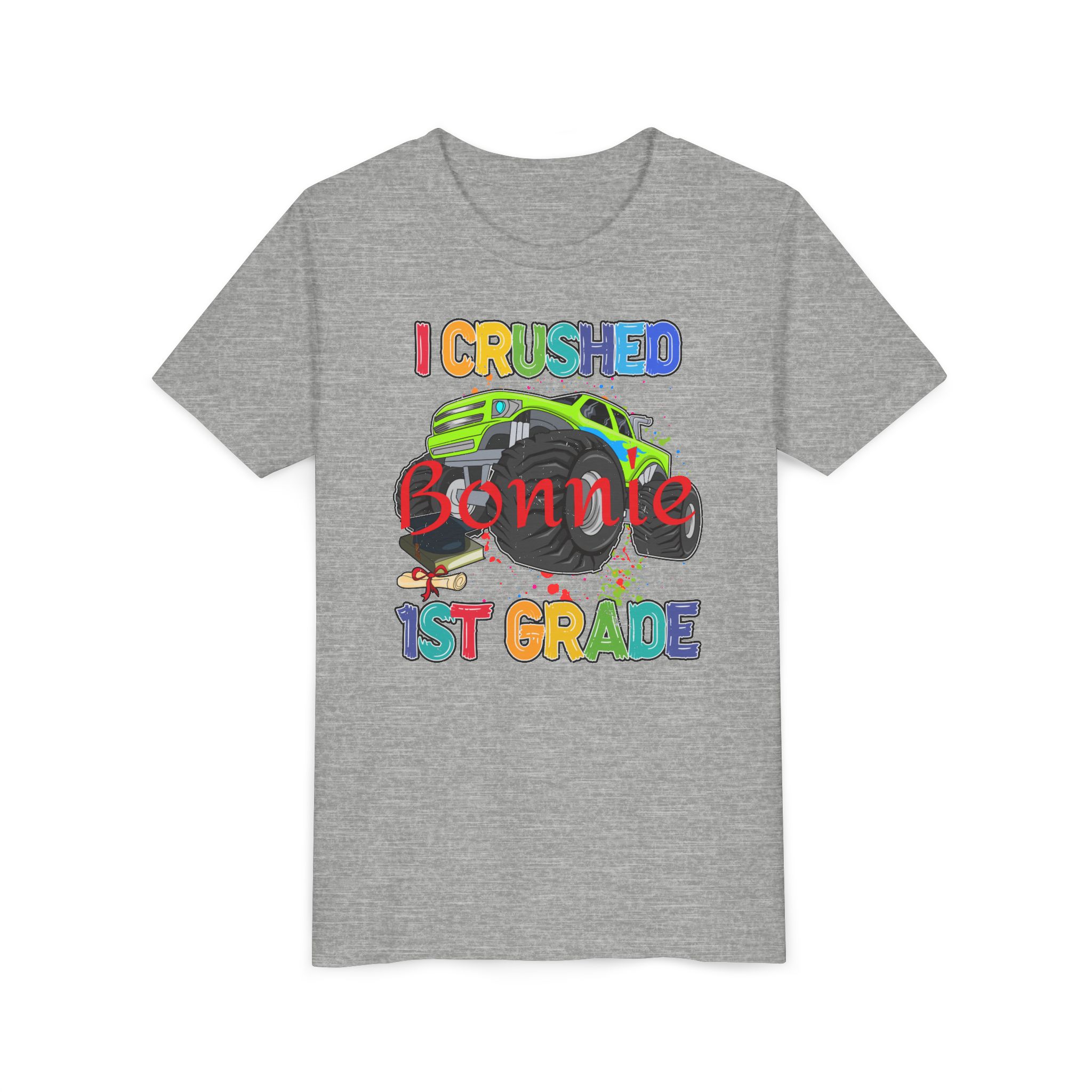 Kids will love this Personalized I Crushed 1st Grade Youth short-sleeve tee. This lightweight (4.0 oz) side-seamed shirt maximizes comfort all day long. The ring-spun cotton makes this kid’s short sleeve tee perfect for displaying custom artwork. Side seams keep the garment’s shape. The shoulders have tape for longer fitting. The collar is extra elastic due to ribbed knitting.